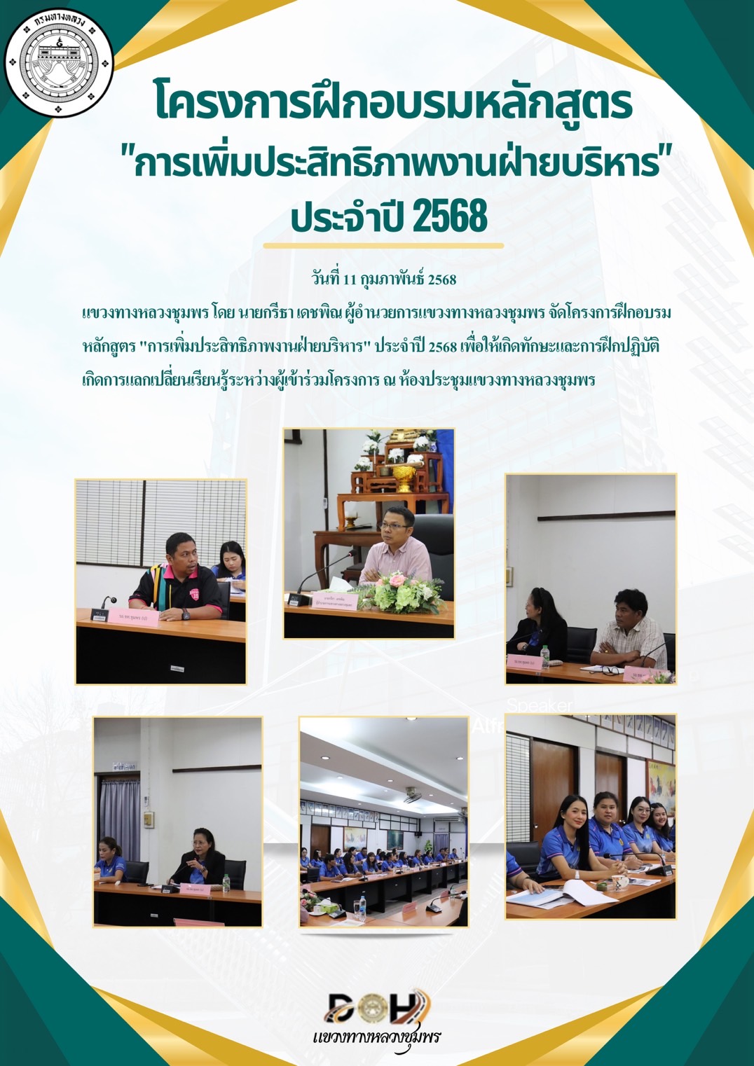 วันอังคารที่ 17 มิถุนายน 2568 แขวงทางหลวงชุมพร โดยนายกรีธา เดชพิณ ผู้อำนวยการแขวงทางหลวงชุมพร ได้มอบหมายให้ นางมาลี ไชยมงคล รองผู้อำนวยการแขวงทางหลวงชุมพร ฝ่ายบริหารจัดอบรมพนักงานรักษาความปลอดภัย หลักสูตร "การจัดการความปลอดภัยการจราจรของพนักงานรักษาความปลอดภัยแขวงทางหลวงชุมพร "