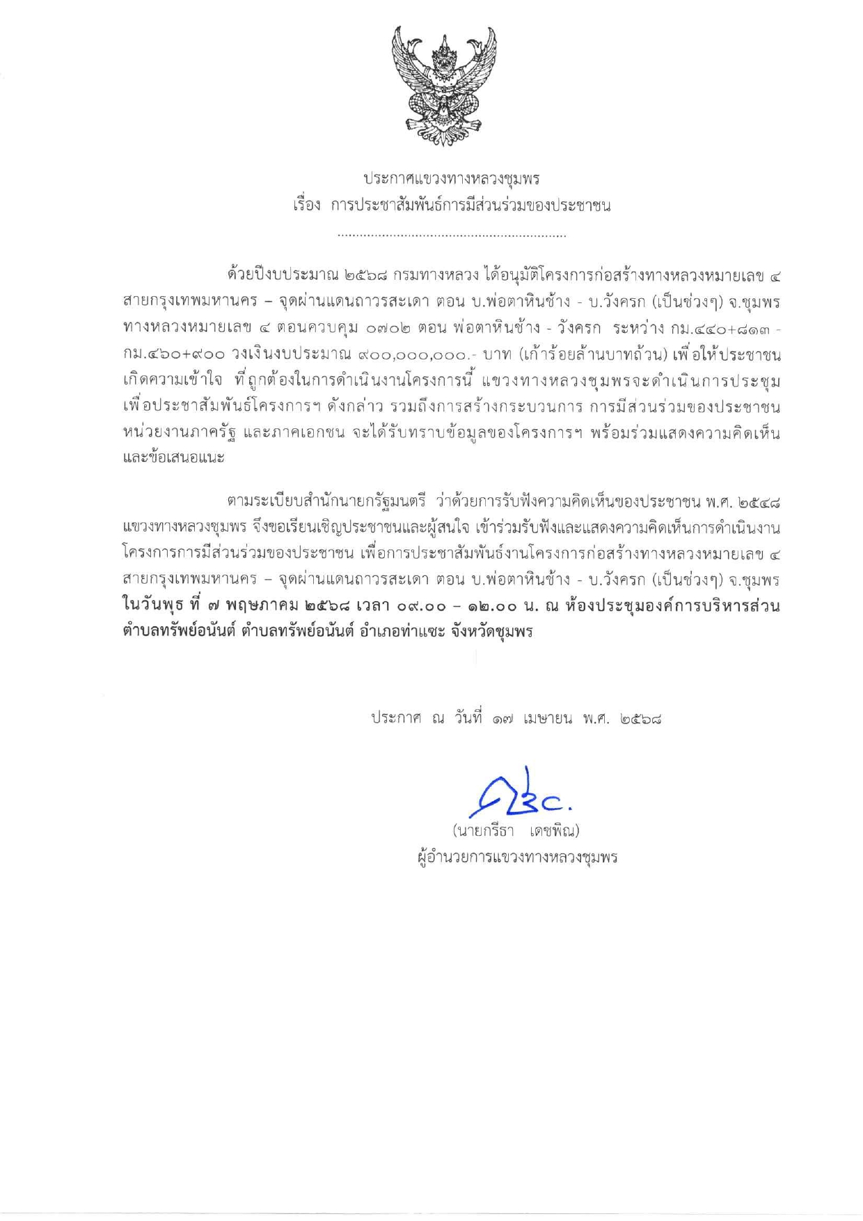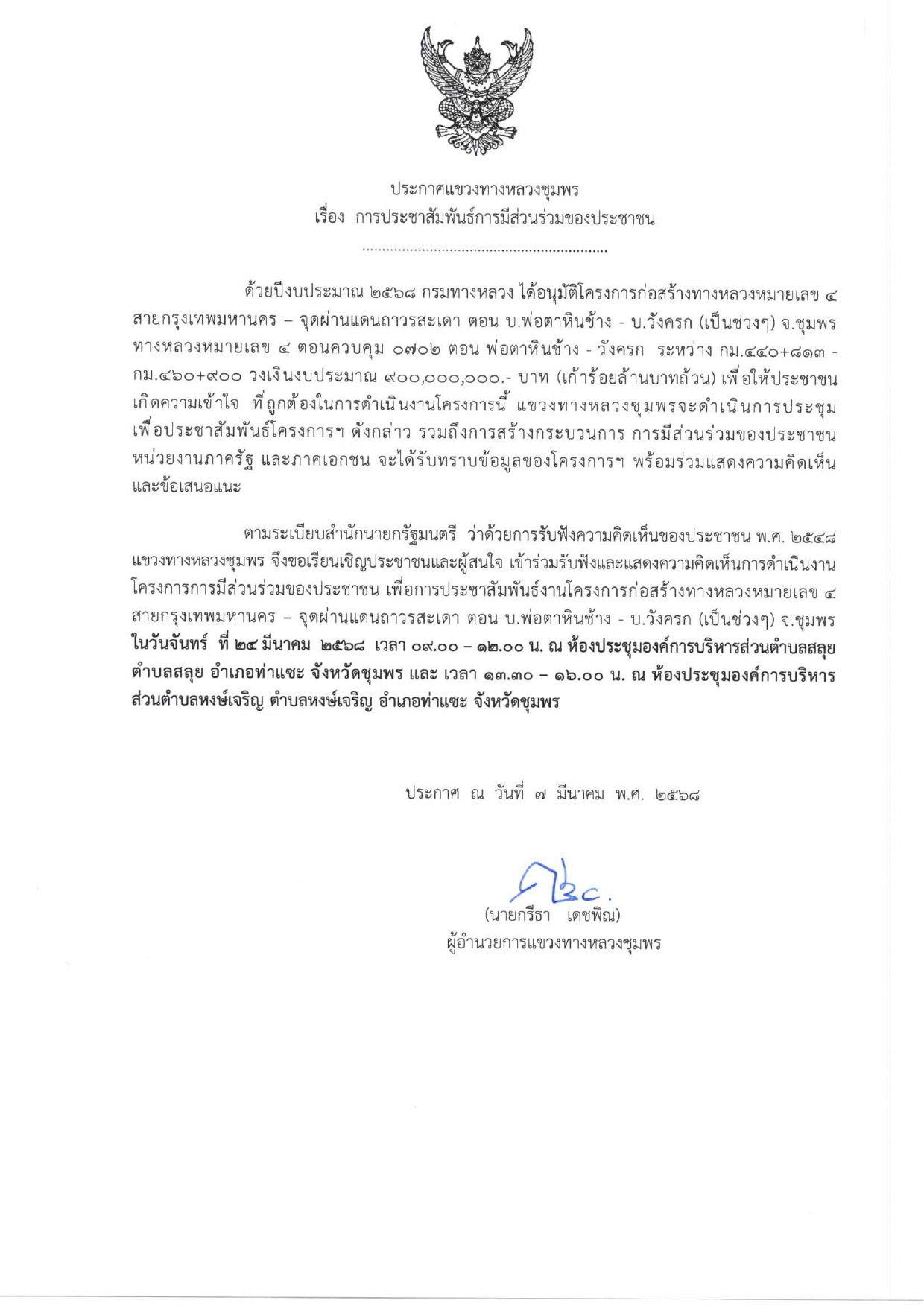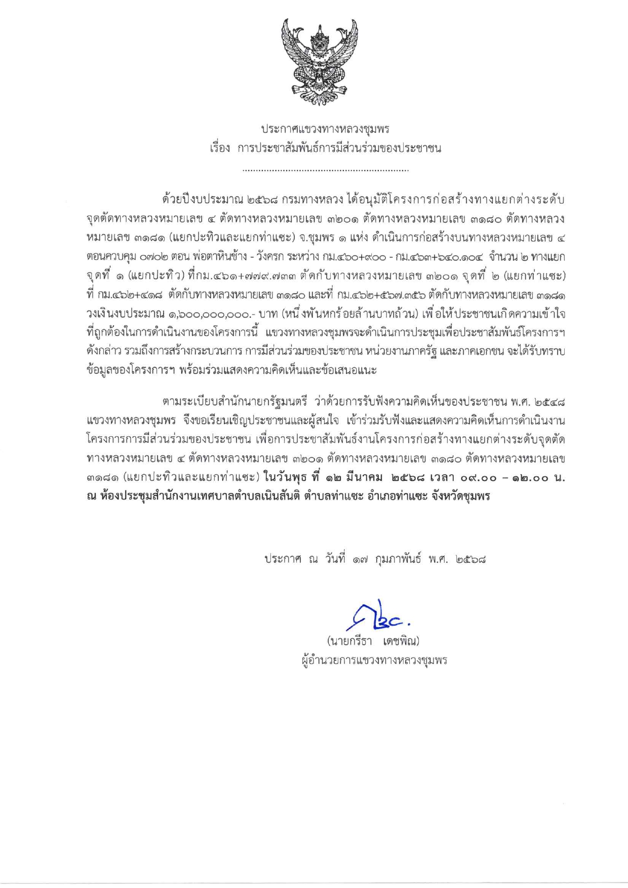 ขอเชิญประชาชนสองข้างทาง และผู้สนใจเข้าร่วม โครงการการมีส่วนร่วมของประชาชน โครงการก่อสร้างทางแยกต่างระดับจุดตัด ทางหลวงหมายเลข 4 ตัดทางหลวงหมายเลข 3201 ตัดทางหลวงหมายเลข 3180 ตัดทางหลวงหมายเลข 3181 (แยกปะทิวและแยกท่าแซะ)