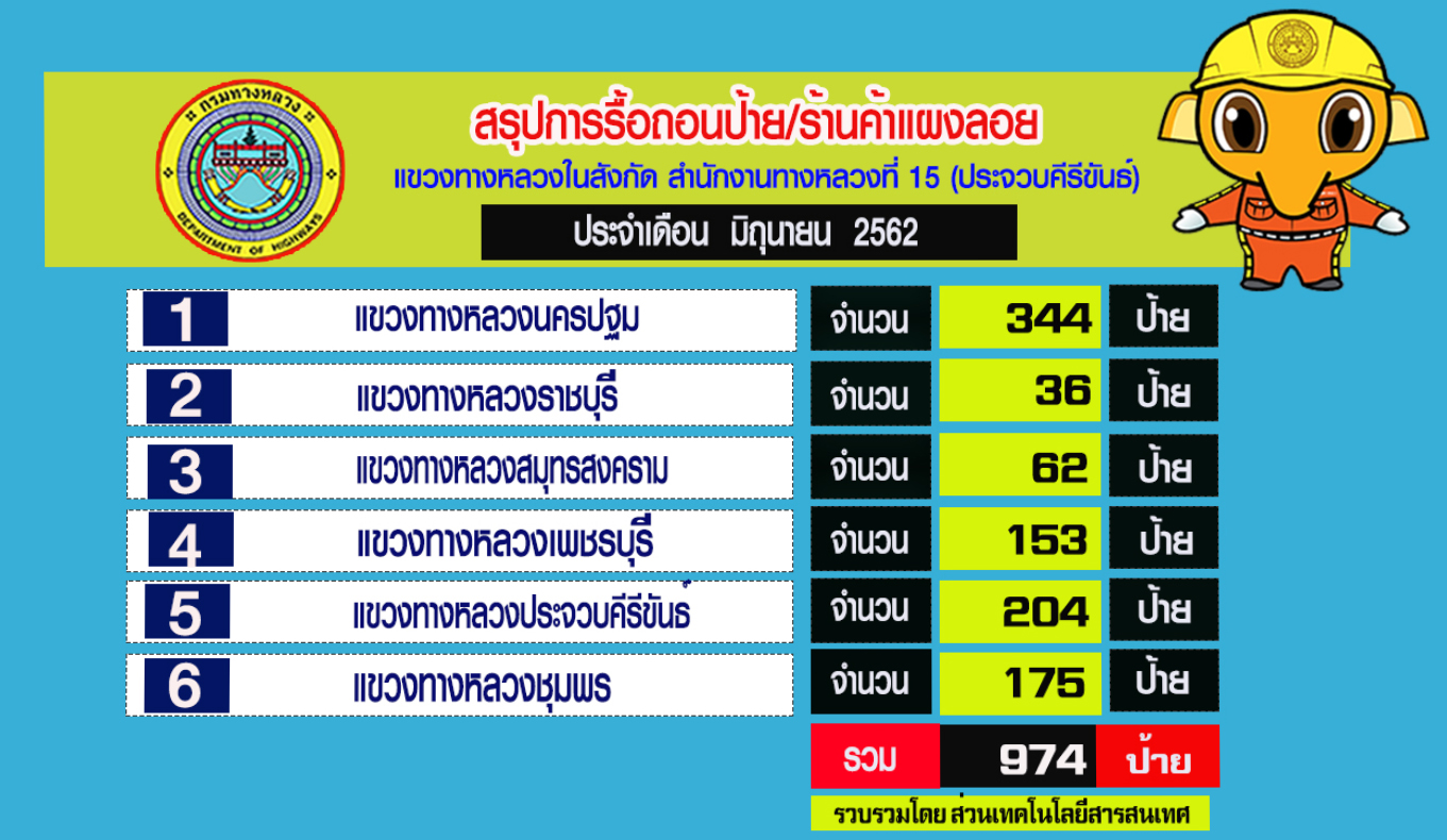 ผลการรื้อถอนป้ายโฆษณาที่ไม่ได้รับอนุญาตในเขตทางหลวง ประจำเดือนมิถุนายน 2562