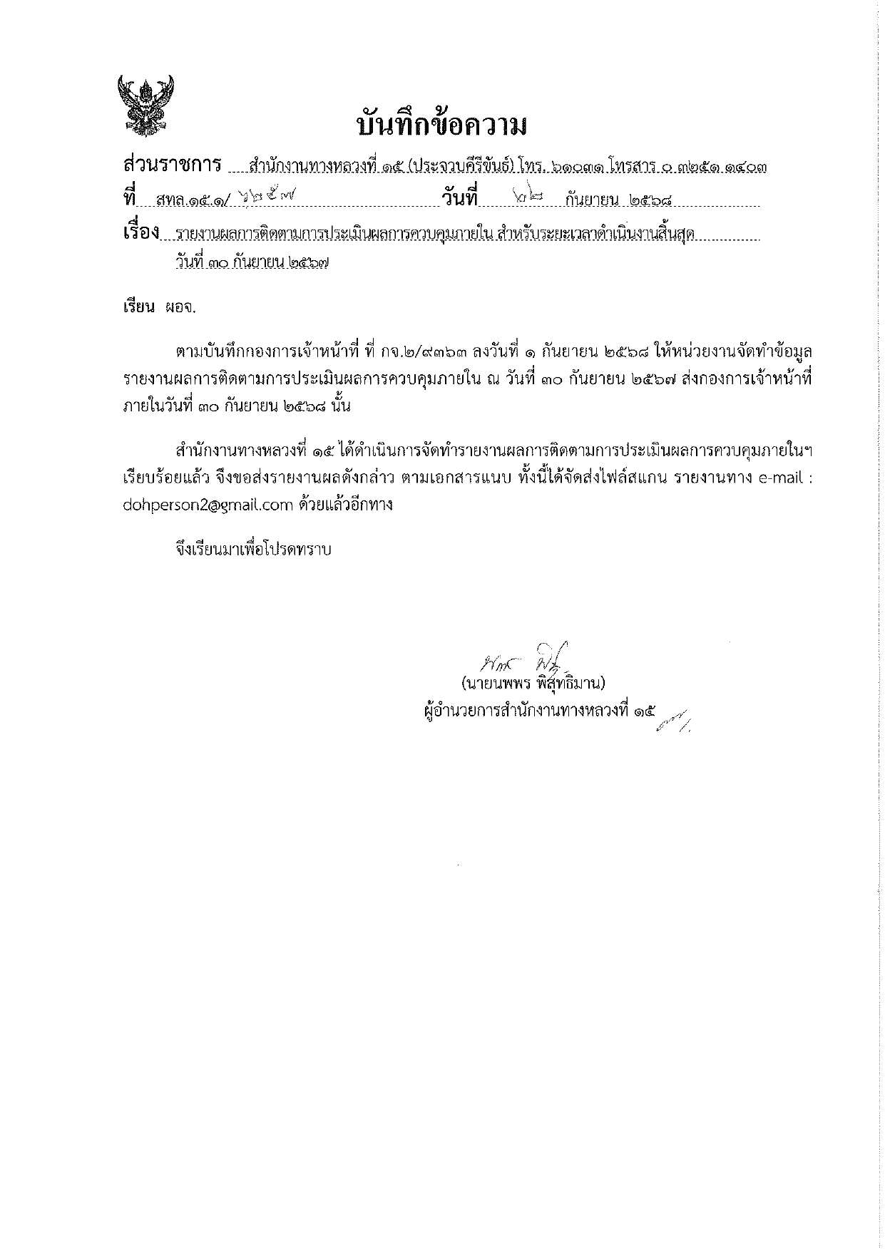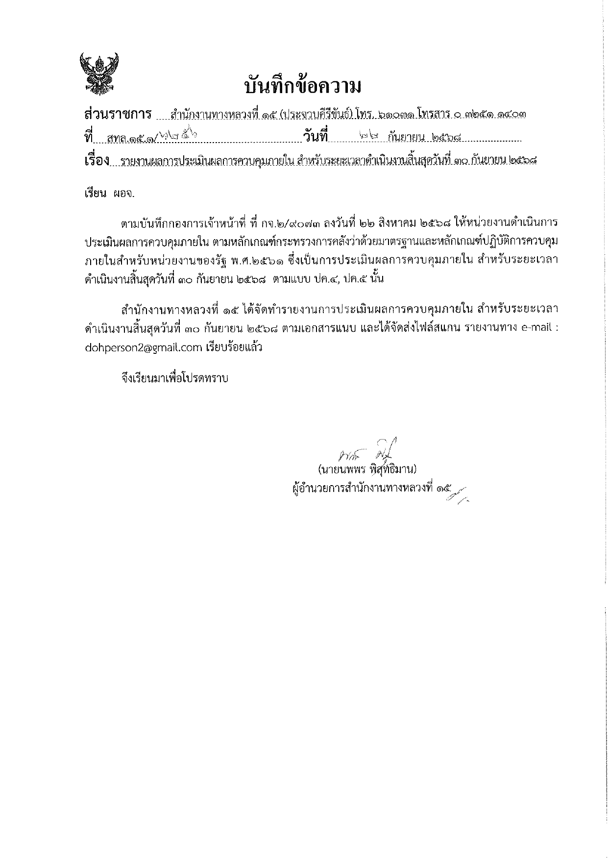 รายงานผลการติดตามการประเมินผลการควบคุมภายใน สำหรับระยะเวลาดำเนินงานสิ้นสุดวันที่ 30 กันยายน 2568