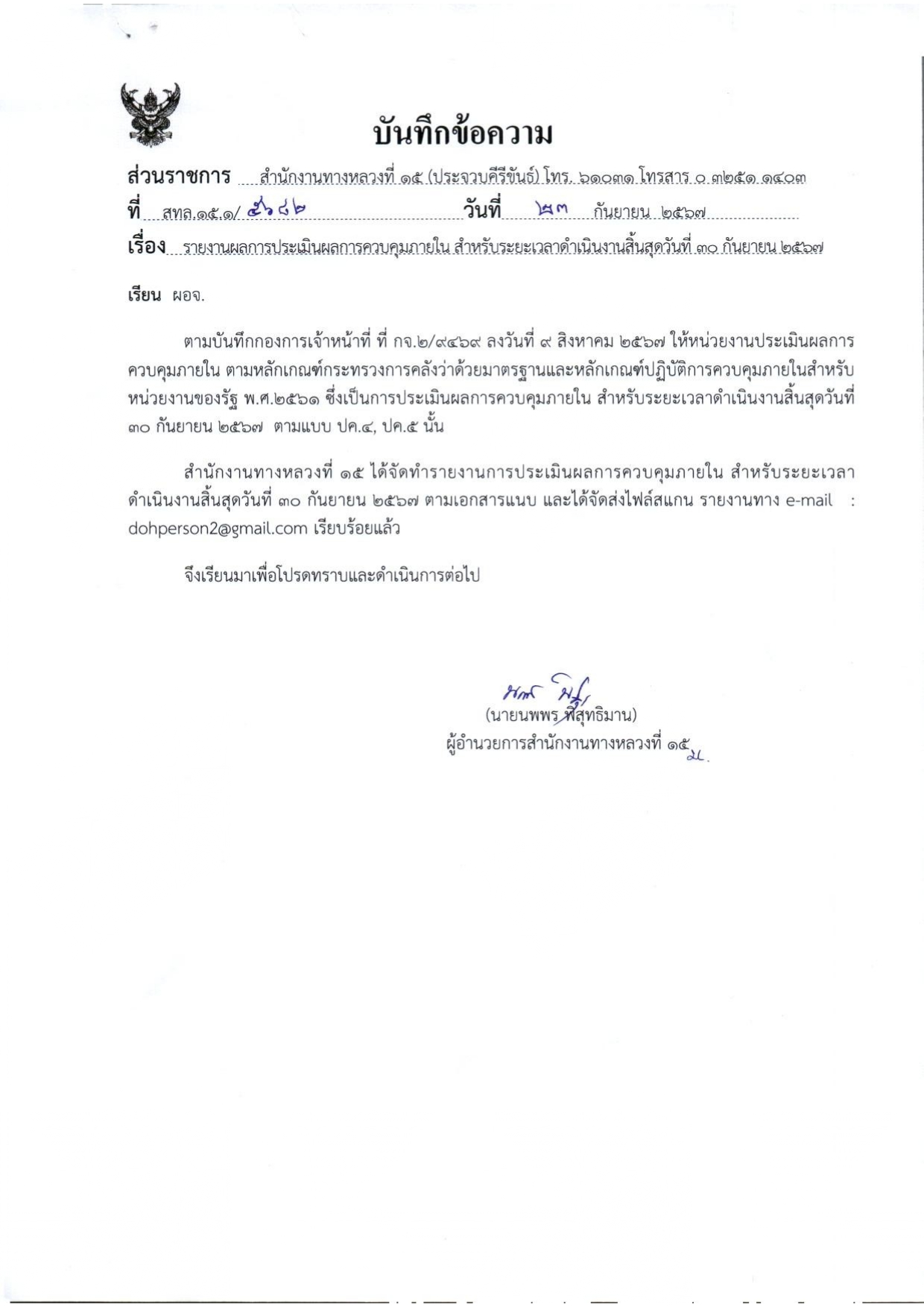 รายงานผลการประเมินผลการควบคุมภายใน สำหรับระยะเวลาดำเนินงานสิ้นสุด วันที่ 30 กันยายน 2567