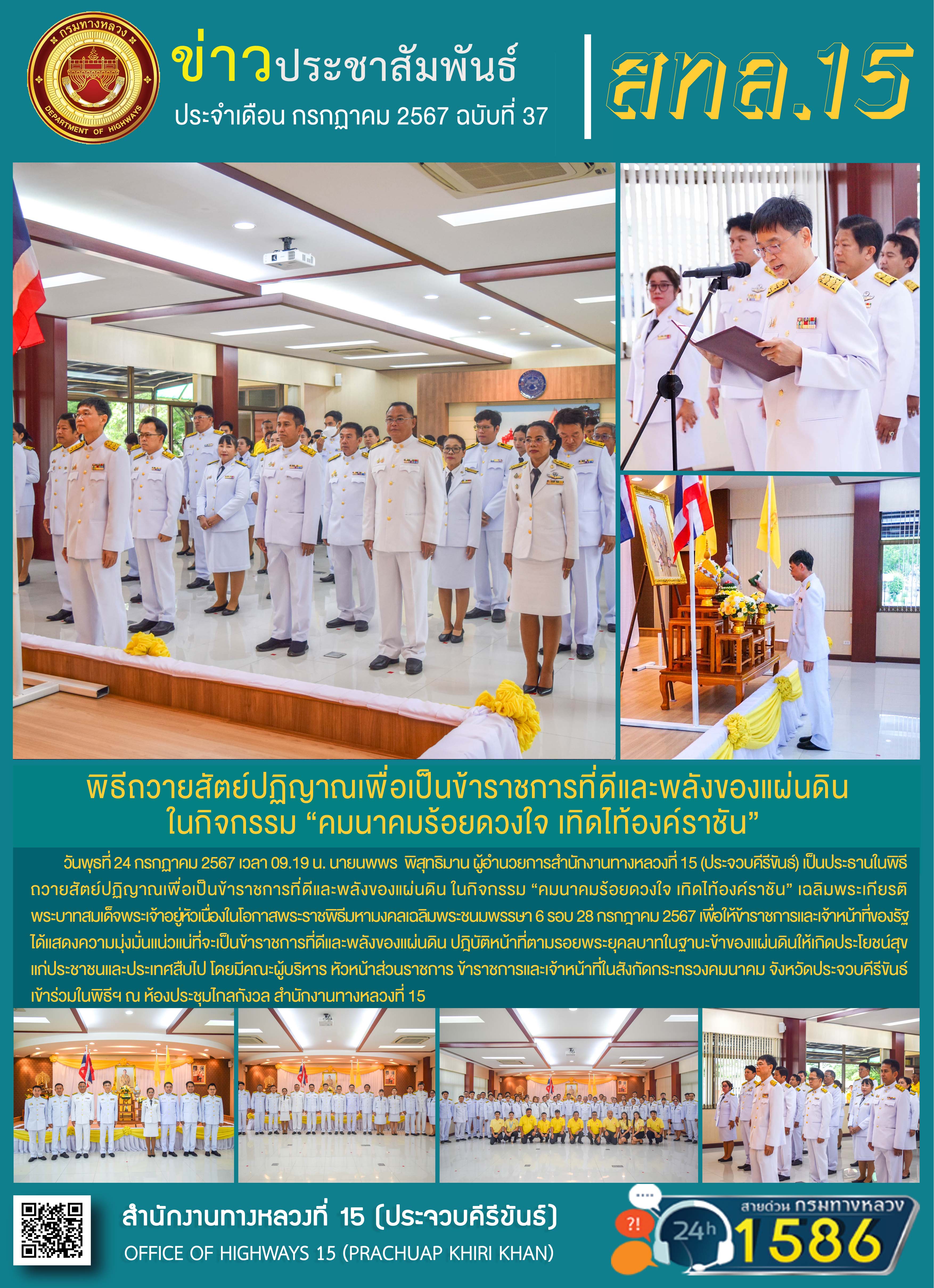 วันพุธที่ 24 กรกฎาคม 2567 เวลาประมาณ 09.19 น. นายนพพร พิสุทธิมาน ผู้อำนวยการสำนักงานทางหลวงที่ 15 เป็นประธานในพิธีถวายสัตย์ปฏิญาณเพื่อเป็นข้าราชการที่ดีและพลังของแผ่นดิน ในกิจกรรม”คมนาคมร้อยดวงใจ เทิดไท้องค์ราชัน” เฉลิมพระเกียรติพระบาทสมเด็จพระเจ้าอยู่หัวเนื่องในโอกาสพระราชพิธีมหามงคลเฉลิมพระชนมพรรษา 6 รอบ 28 กรกฎาคม 2567 เพื่อให้ข้าราชการและเจ้าหน้าที่ของรัฐ ได้แสดงความมุ่งมั่นแน่วแน่ที่จะเป็นข้าราชการที่ดีและพลังของแผ่นดิน ปฏิบัติหน้าที่ตามรอยพระยุคลบาทในฐานะข้าของแผ่นดินให้เกิดประโยชน์สุขแก่ประชาชนและประเทศชาติสืบไป โดยมีคณะผู้บริหาร หัวหน้าส่วนราชการ ข้าราชการและเจ้าหน้าที่ในสังกัดกระทรวงคมนาคม จังหวัดประจวบคีรีขันธ์ เข้าร่วมในพิธีฯ ณ ห้องประชุมไกลกังวล สำนักงานทางหลวงที่ 15