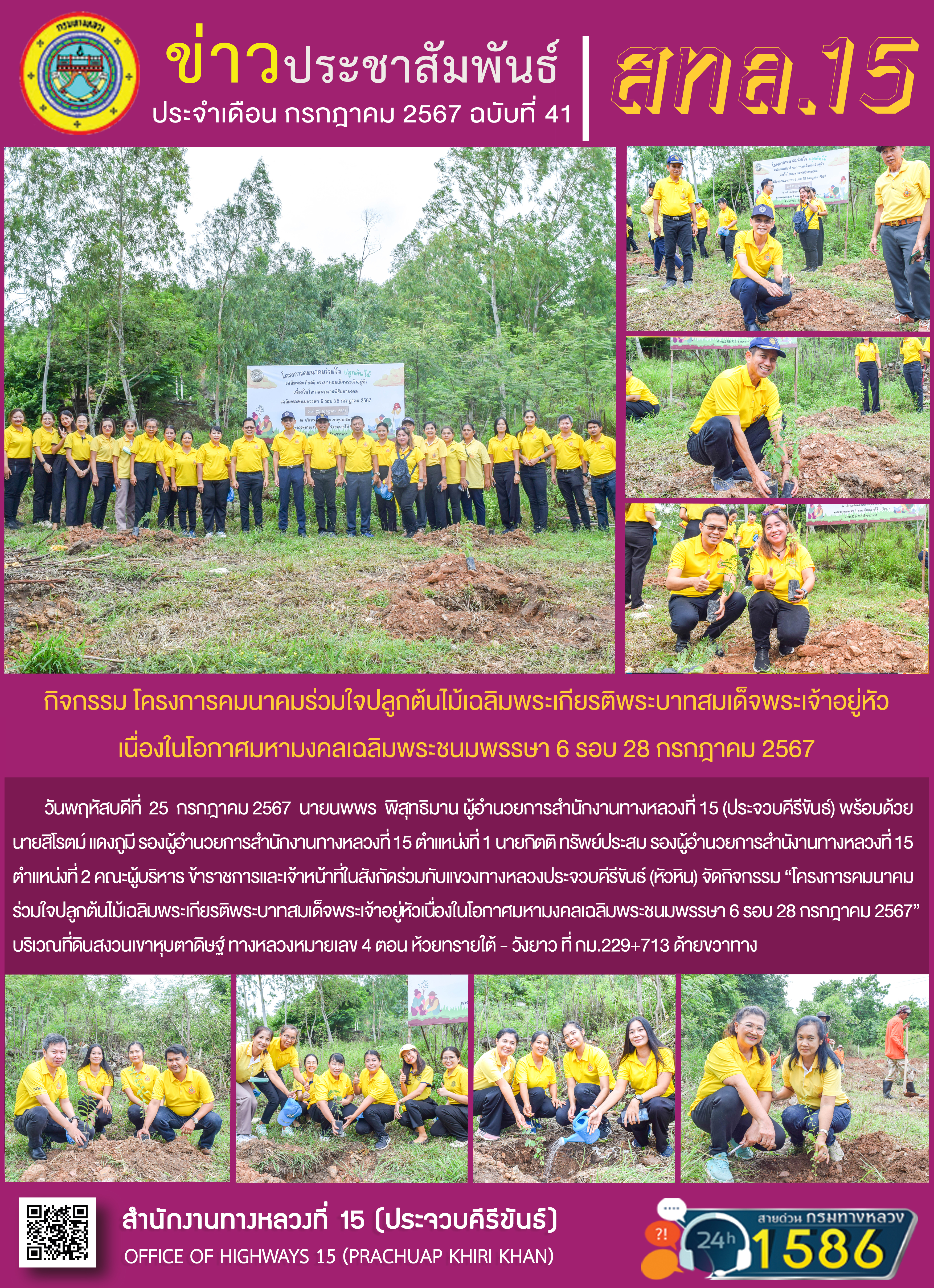 วันพฤหัสบดีที่ 25 กรกฎาคม 2567 นายนพพร พิสุทธิมาน ผู้อำนวยการสำนักงานทางหลวงที่ 15 พร้อมด้วยนายสิโรตม์ แดงภูมี รองผู้อำนวยการสำนักงานทางหลวงที่ 15 ตำแหน่งที่ 1 นายกิตติ ทรัพย์ประสม รองผู้อำนวยการสำนักงานทางหลวงที่ 15 ตำแหน่งที่ 2 คณะผู้บริหาร ข้าราชการและเจ้าหน้าที่ในสังกัด ร่วมกับแขวงทางหลวงประจวบคีรีขันธ์(หัวหิน) จัดกิจกรรม “โครงการคมนาคมร่วมใจปลูกต้นไม้ เฉลิมพระเกียรติพระบาทสมเด็จพระเจ้าอยู่หัวเนื่องในโอกาสพระราชพิธีมหามงคลเฉลิมพระชนมพรรษาหกรอบ 28 กรกฎาคม 2567” บริเวณที่ดินสงวนเขาหุบตาดิษฐ์ ทางหลวงหมายเลข 4 ตอน ห้วยทรายใต้ - วังยาว ที่ กม.229+713 ด้านขวาทาง