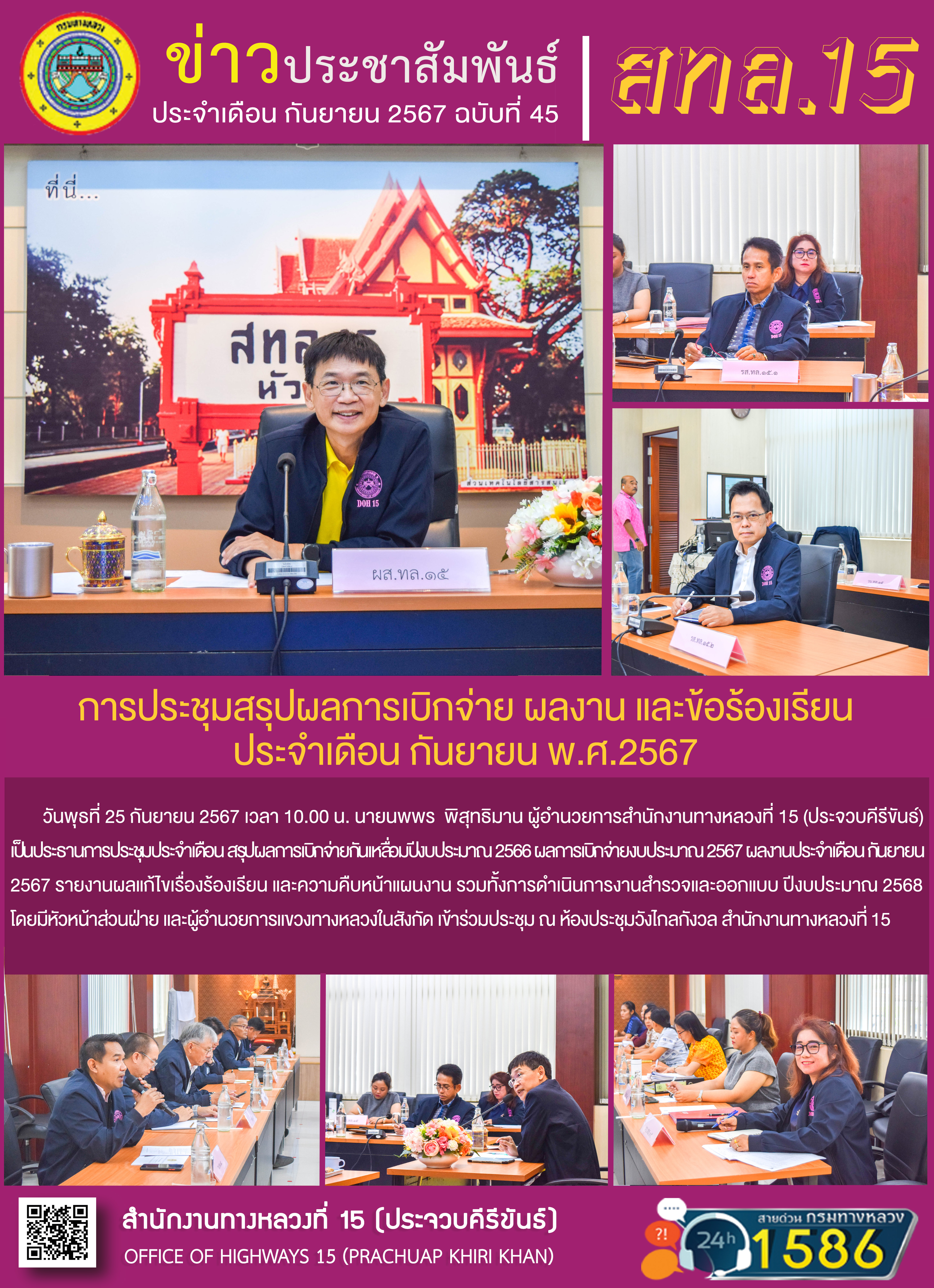 วันพุธที่ 25 กันยายน 2567 เวลา 10.00 น. นายนพพร พิสุทธิมาน ผู้อำนวยการสำนักงานทางหลวงที่ 15 (ประจวบคีรีขันธ์) เป็นประธานการประชุมประจำเดือน สรุปผลการเบิกจ่ายกันเหลื่อมปีงบประมาณ 2566 ผลการเบิกจ่ายงบประมาณ 2567 ผลงานประจำเดือน กันยายน 2567 รายงานผลแก้ไขเรื่องร้องเรียนและความคืบหน้าแผนงาน รวมทั้งการดำเนินการงานสำรวจและออกแบบ ปีงบประมาณ 2568 โดยมีหัวหน้าส่วนฝ่าย และผู้อำนวยการแขวงทางหลวงในสังกัด เข้าร่วมประชุม ณ ห้องประชุมวังไกลกังวล สำนักงานทางหลวงที่ 15