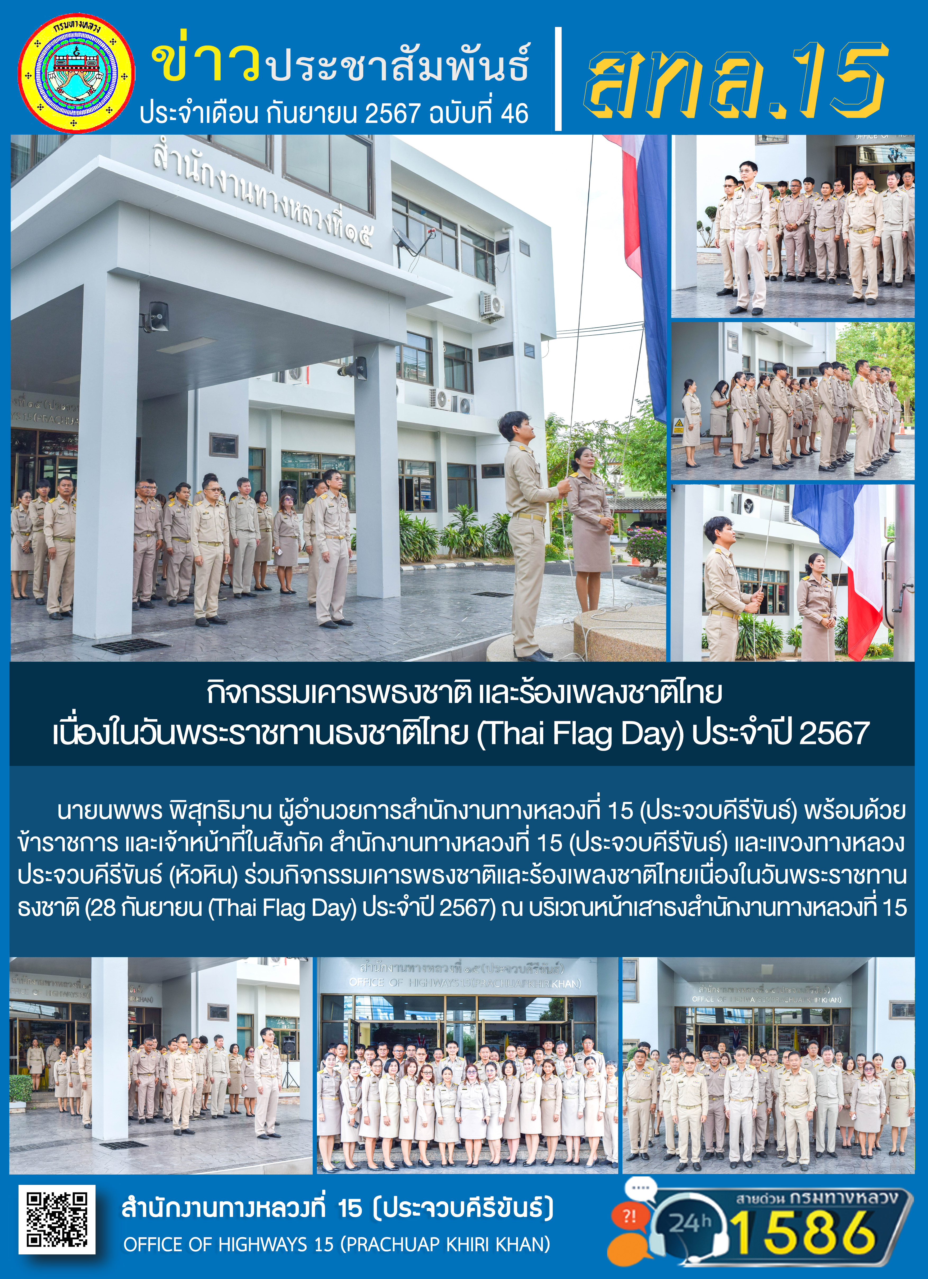นายนพพร พิสุทธิมาน ผู้อำนวยการสำนักงานทางหลวงที่ 15 พร้อมด้วยข้าราชการและเจ้าหน้าที่ในสังกัดสำนักงานทางหลวงที่ 15 และแขวงทางหลวงประจวบคีรีขันธ์(หัวหิน) ร่วมกิจกรรมเคารพธงชาติและร้องเพลงชาติไทย เนื่องในวันพระราชทานธงชาติไทย (28 กันยายน (Thai National Flag Day) ประจำปี 2567) ณ บริเวณหน้าเสาธงสำนักงานทางหลวงที่ 15