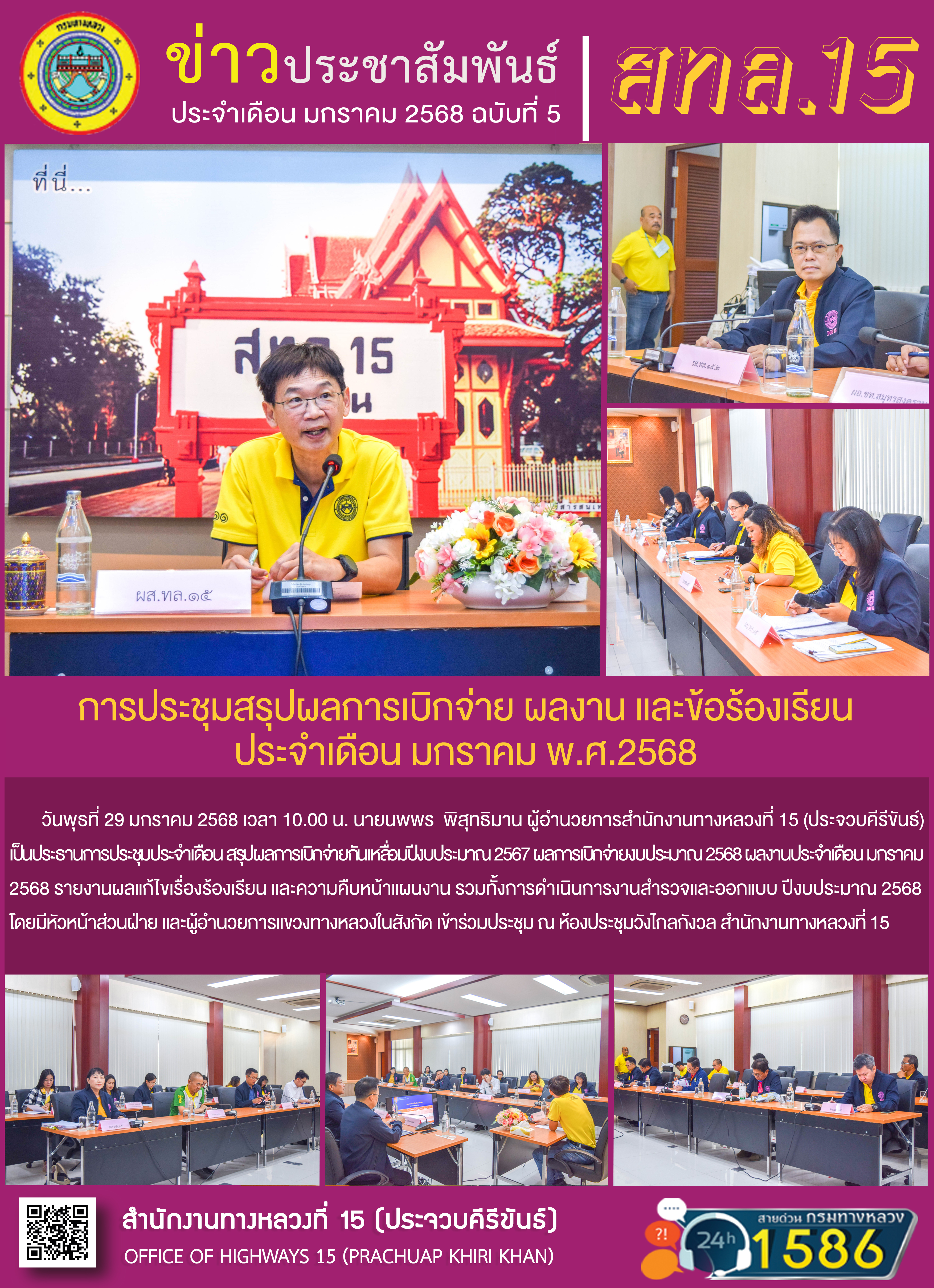 วันพุธที่ 29 มกราคม 2568 เวลา 10.00 น. นายนพพร พิสุทธิมาน ผู้อำนวยการสำนักงานทางหลวงที่ 15 (ประจวบคีรีขันธ์)