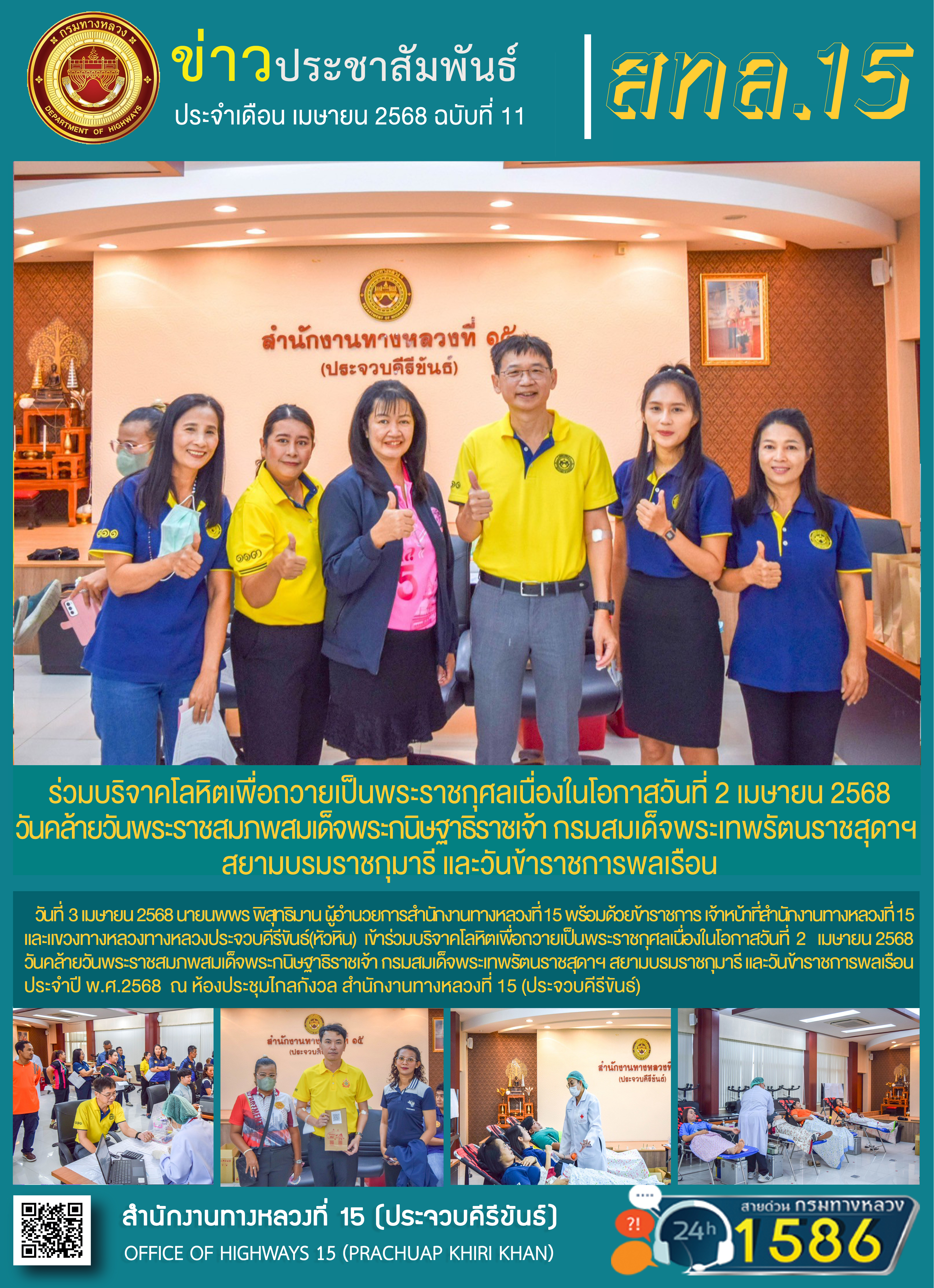 วันที่ 3 เมษายน 2568 นายนพพร พิสุทธิมาน ผู้อำนวยการสำนักงานทางหลวงที่ 15 พร้อมด้วยข้าราชการ เจ้าหน้าที่สำนักงานทางหลวงที่ 15 และแขวงทางหลวงทางหลวงประจวบคีรีขันธ์(หัวหิน) เข้าร่วมบริจาคโลหิตเพื่อถวายเป็นพระราชกุศลเนื่องในโอกาสวันที่ ๒ เมษายน ๒๕๖๘ วันคล้ายวันพระราชสมภพสมเด็จพระกนิษฐาธิราชเจ้า กรมสมเด็จพระเทพรัตนราชสุดาฯ สยามบรมราชกุมารี และวันข้าราชการพลเรือน ประจำปี พ.ศ.2568 ณ ห้องประชุมไกลกังวล สำนักงานทางหลวงที่ 15(ประจวบคีรีขันธ์)