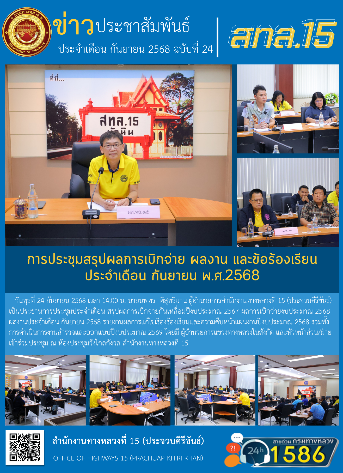 วันพุธที่ 24 กันยายน 2568 เวลา 14.00 น. นายนพพร พิสุทธิมาน ผู้อำนวยการสำนักงานทางหลวงที่ 15 (ประจวบคีรีขันธ์)เป็นประธานการประชุมประจำเดือน สรุปผลการเบิกจ่ายกันเหลื่อมปีงบประมาณ 2567 ผลการเบิกจ่ายงบประมาณ 2568 ผลงานประจำเดือน กันยายน 2568 รายงานผลการแก้ไขเรื่องร้องเรียนและความคืบหน้าแผนงานปีงบประมาณ 2568 รวมทั้งการดำเนินการงานสำรวจและออกแบบปีงบประมาณ 2569 โดยมี ผู้อำนวยการแขวงทางหลวงในสังกัด และหัวหน้าส่วน/ฝ่ายเข้าร่วมประชุม ณ ห้องประชุมวังไกลกังวล สำนักงานทางหลวงที่ 15