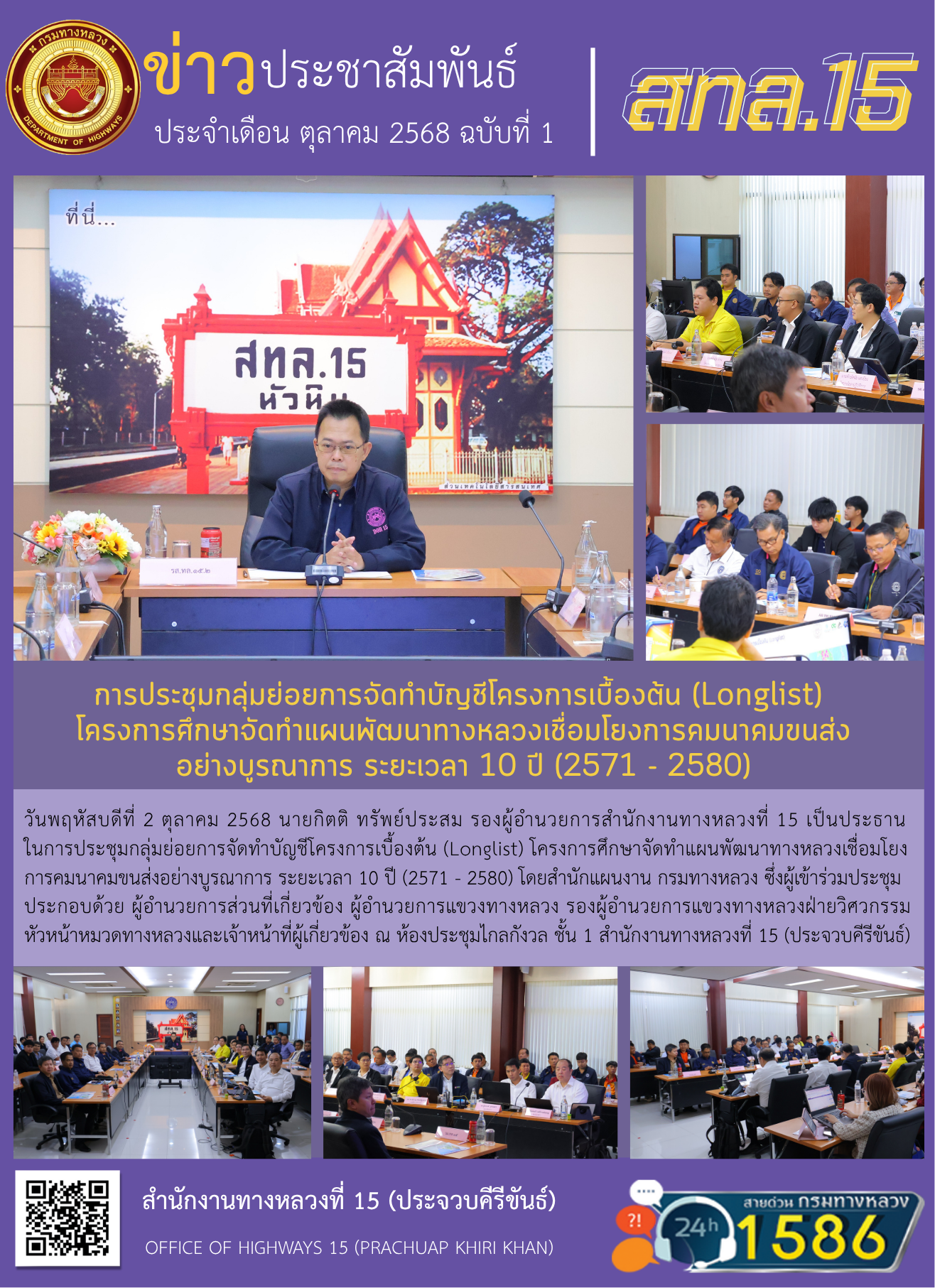 วันพฤหัสบดีที่ 2 ตุลาคม 2568 นายกิตติ ทรัพย์ประสม รองผู้อำนวยการสำนักงานทางหลวงที่ 15 เป็นประธานในการประชุมกลุ่มย่อยการจัดทำบัญชีโครงการเบื้องต้น (Longlist) โครงการศึกษาจัดทำแผนพัฒนาทางหลวงเชื่อมโยงการคมนาคมขนส่งอย่างบูรณาการ ระยะเวลา 10 ปี (2571 - 2580) โดยสำนักแผนงาน กรมทางหลวง ซึ่งผู้เข้าร่วมประชุมประกอบด้วย ผู้อำนวยการส่วนที่เกี่ยวข้อง ผู้อำนวยการแขวงทางหลวง รองผู้อำนวยการแขวงทางหลวงฝ่ายวิศวกรรม หัวหน้าหมวดทางหลวงและเจ้าหน้าที่ผู้เกี่ยวข้อง ณ ห้องประชุมไกลกังวล ชั้น 1 สำนักงานทางหลวงที่ 15 (ประจวบคีรีขันธ์)