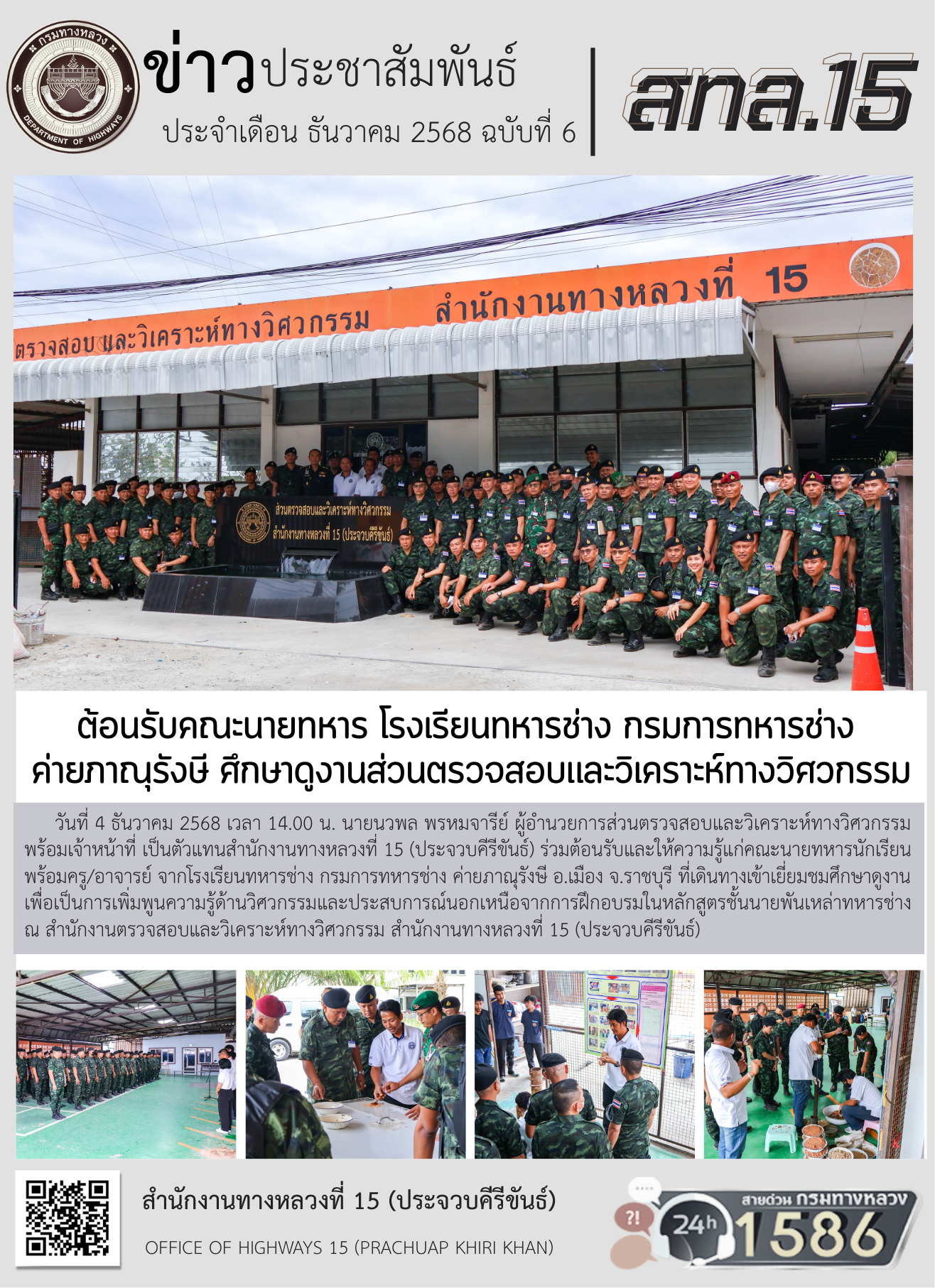 วันที่ 4 ธันวาคม 2568 เวลา 14.00 น. นายนวพล พรหมจารีย์ ผู้อำนวยการส่วนตรวจสอบและวิเคราะห์ทางวิศวกรรม พร้อมเจ้าหน้าที่ เป็นตัวแทนสำนักงานทางหลวงที่ 15 (ประจวบคีรีขันธ์) ร่วมต้อนรับและให้ความรู้แก่คณะนายทหารนักเรียน พร้อมครู/อาจารย์ จากโรงเรียนทหารช่าง กรมการทหารช่าง ค่ายภาณุรังษี อ.เมือง จ.ราชบุรี ที่เดินทางเข้าเยี่ยมชมศึกษาดูงาน เพื่อเป็นการเพิ่มพูนความรู้ด้านวิศวกรรมและประสบการณ์นอกเหนือจากการฝึกอบรมในหลักสูตรชั้นนายพันเหล่าทหารช่าง ณ สำนักงานตรวจสอบและวิเคราะห์ทางวิศวกรรม สำนักงานทางหลวงที่ 15 (ประจวบคีรีขันธ์)