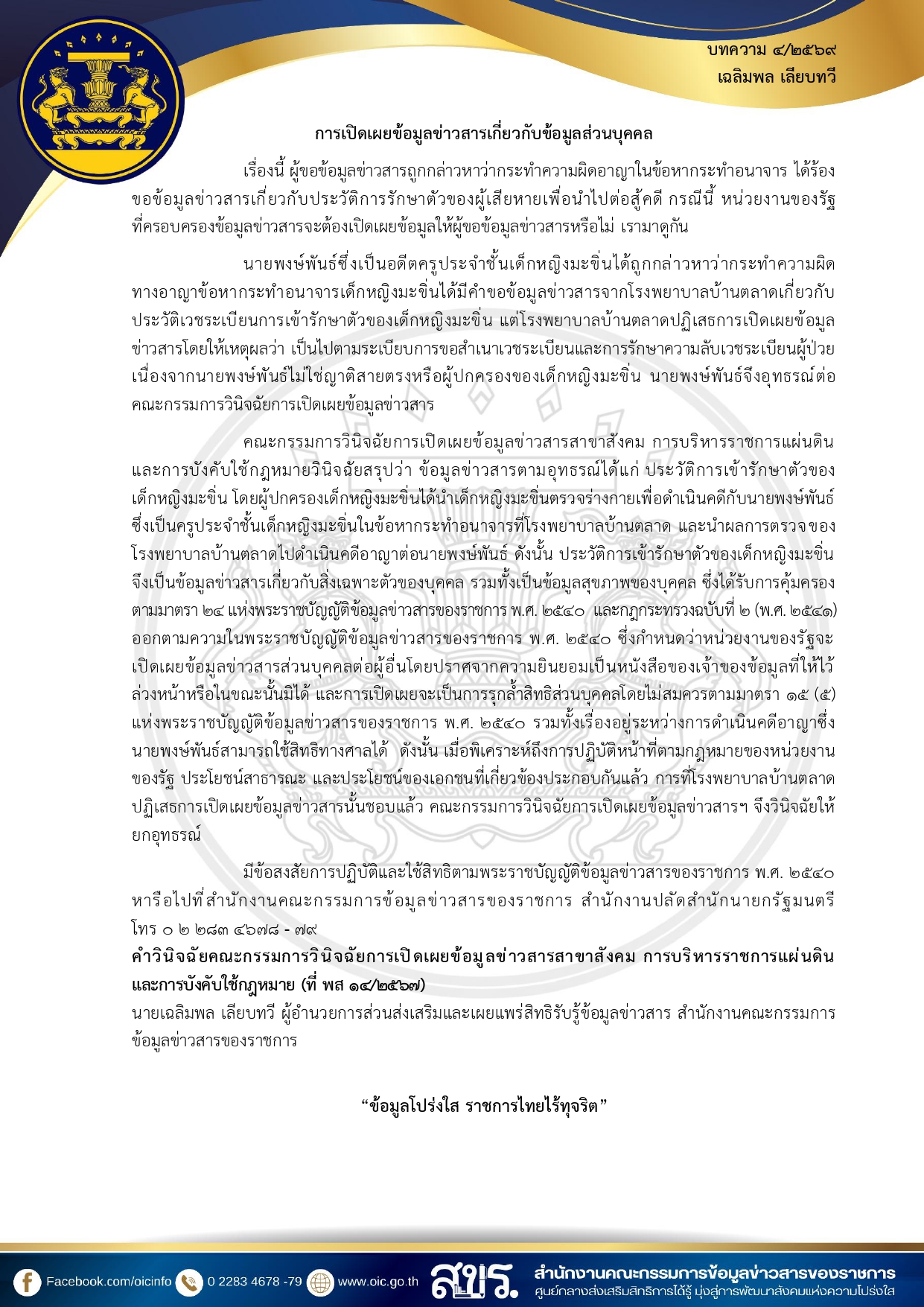 บทความคำวินิจฉัย ประจำเดือน มกราคม 2569 ของคณะกรรมการวิฉัยการเปิดเผยข้อมูลข่าวสาร เพื่อเผยแพร่ความรู้แก่ประชาชนและข้าราชการ ในการปฏิบัติตาม พระราชบัญญัติข้อมูลข่าวสารของราชการ พ.ศ. 2540
