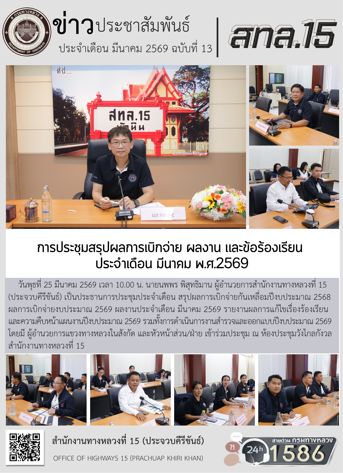 วันพุธที่ 25 มีนาคม 2569 เวลา 10.00 น. นายนพพร พิสุทธิมาน ผู้อำนวยการสำนักงานทางหลวงที่ 15 (ประจวบคีรีขันธ์) เป็นประธานการประชุมประจำเดือน สรุปผลการเบิกจ่ายกันเหลื่อมปีงบประมาณ 2568 ผลการเบิกจ่ายงบประมาณ 2569 ผลงานประจำเดือน มีนาคม 2569 รายงานผลการแก้ไขเรื่องร้องเรียนและความคืบหน้าแผนงานปีงบประมาณ 2569 รวมทั้งการดำเนินการงานสำรวจและออกแบบปีงบประมาณ 2569 โดยมี ผู้อำนวยการแขวงทางหลวงในสังกัด และหัวหน้าส่วน/ฝ่าย เข้าร่วมประชุม ณ ห้องประชุมวังไกลกังวล สำนักงานทางหลวงที่ 15