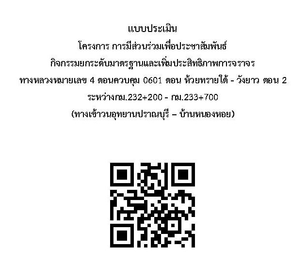 ขอความร่วมมือจากท่าน ร่วมแสดงความคิดเห็นเกี่ยวกับโครงการดังกล่าว โดยการตอบแบบประเมินออนไลน์ผ่านการแสกน QR CODE เพื่อรวบรวมความเห็นของท่านและนำไปปรับปรุงการดำเนินการต่อไป