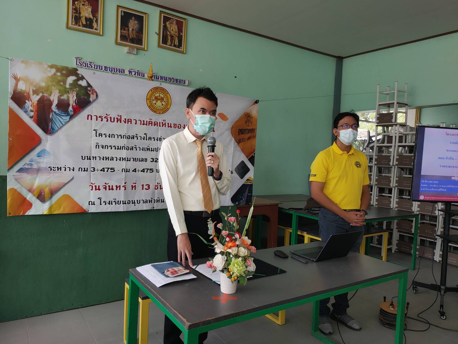แขวงทางหลวงประจวบคีรีขันธ์(หัวหิน) ดำเนินการโครงการ การมีส่วนร่วมของประชาชน สำหรับโครงการก่อสร้างโครงข่ายทางหลวงแผ่นดิน กิจกรรมก่อสร้างเพิ่มประสิทธิภาพทางหลวง บนทางหลวงหมายเลข 3218 ตอน หัวหิน - โป่งแย้ ระหว่าง กม.3+475 - กม.4+475 บริเวณวัดเพชราวุธ - หมู่บ้านศิลปิน ณ โรงเรียนอนุบาลหัวหิน (บ้านหนองขอน)
